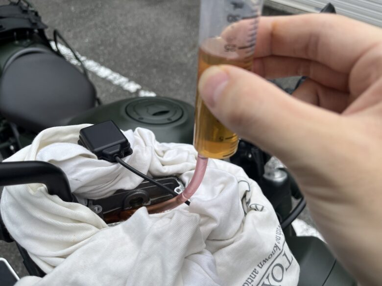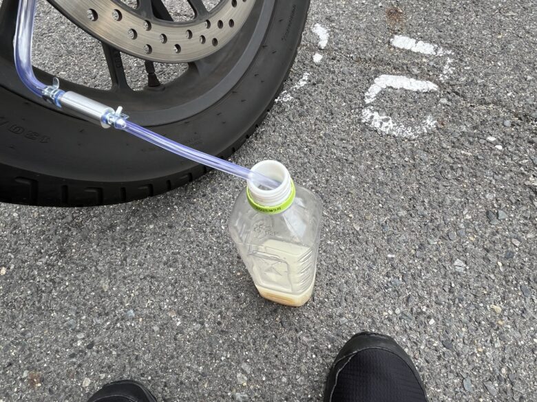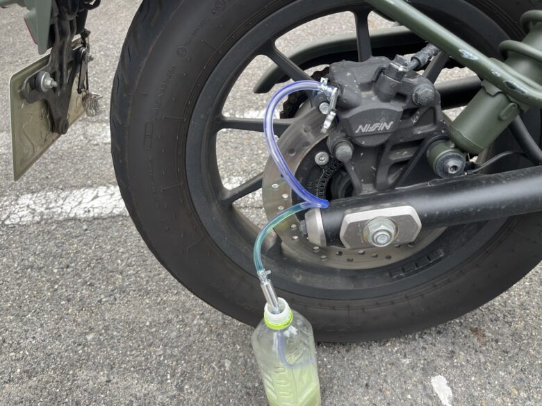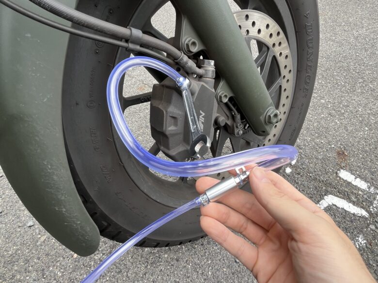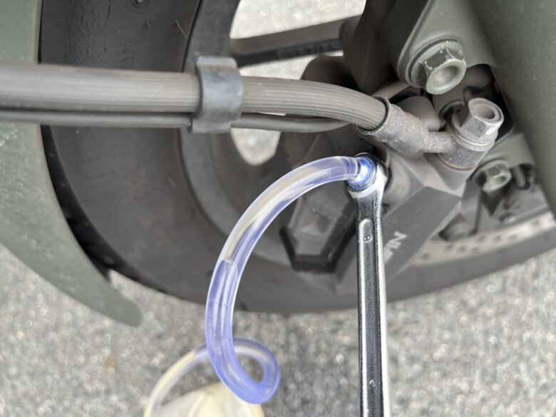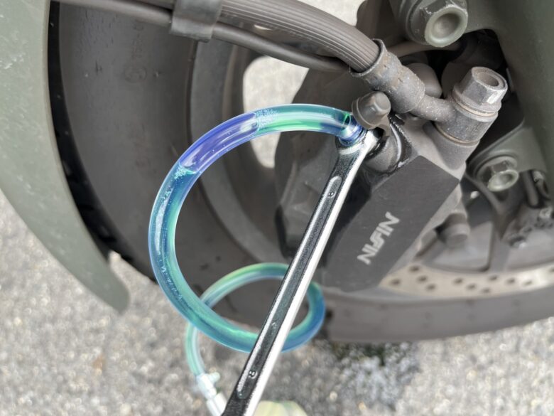 ブレーキレバーを繰り返し握り、排出されるブレーキフルードの色が濁っていないものになったら交換ができた合図です。