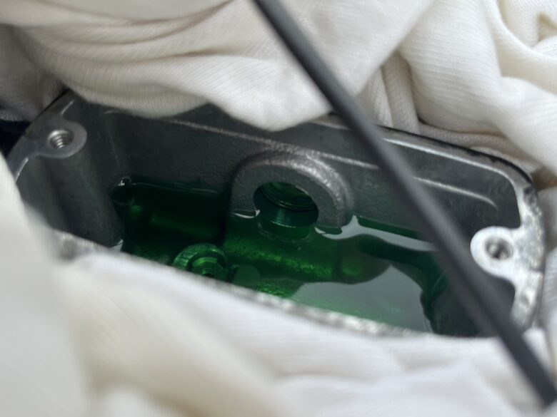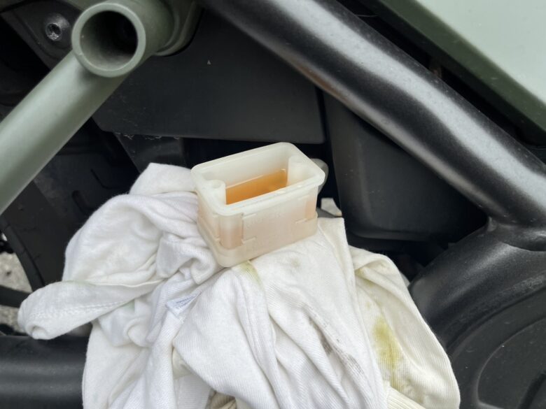 リア側のタンクは固定されていないので、ウエスなどを使って上手い具合に水平を保ちブレーキフルードを入れます。
