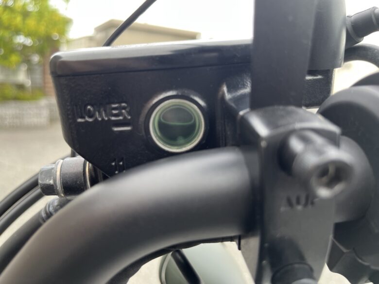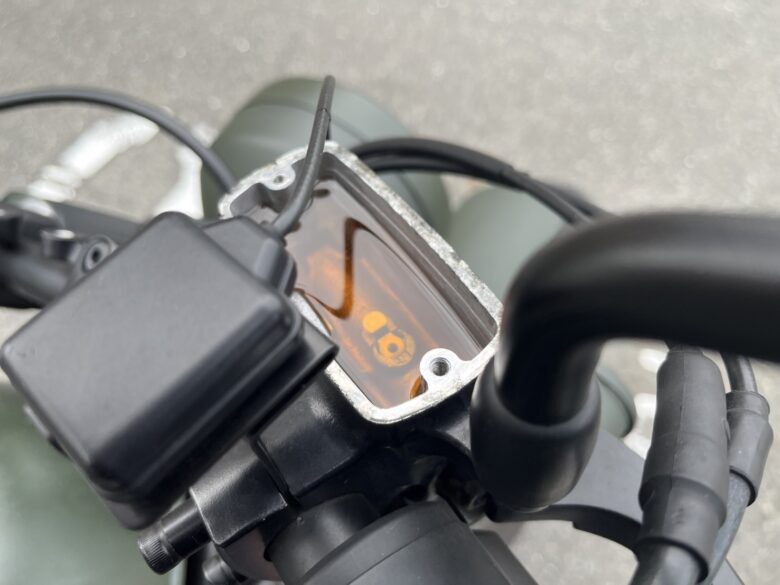 ブレーキレバー側のミラー付近にリザーブタンクがあります。