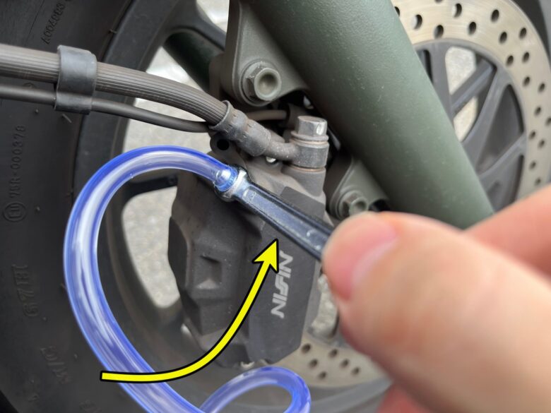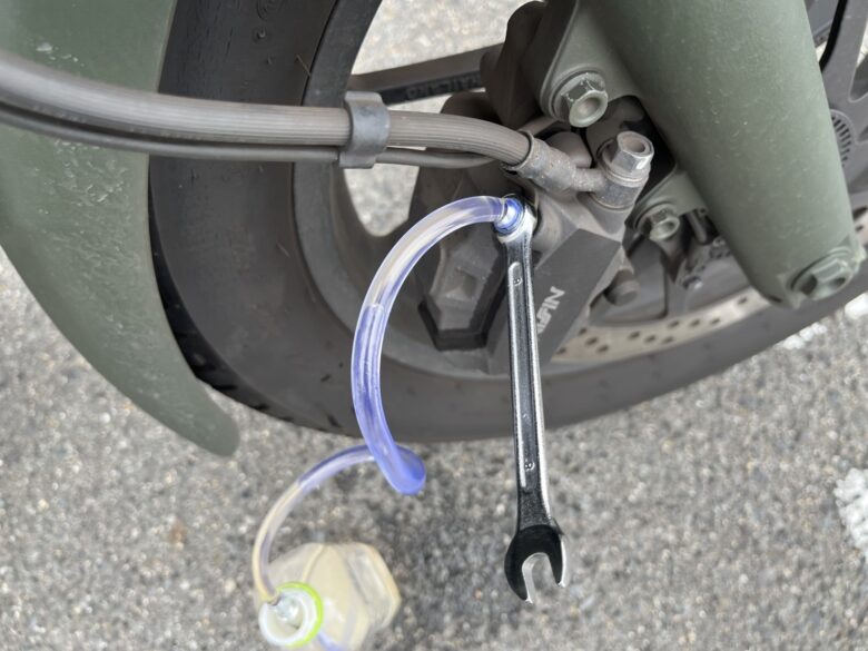 キャリパーはリアタイヤにあり、同じようにキャップを外し、レンチをはめてチューブをとりつけます。