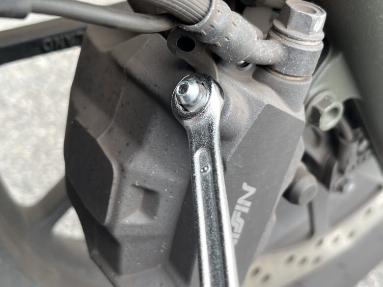 レンチで少しだけ開きます(開きすぎたらそこからブレーキフルードが漏れ出てきます)。