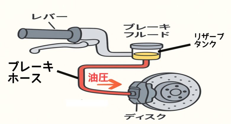 ブレーキはレバーを引く力を油圧でキャリーパーに伝える仕組みになっていて、その油圧に使われているものがブレーキフルードです。