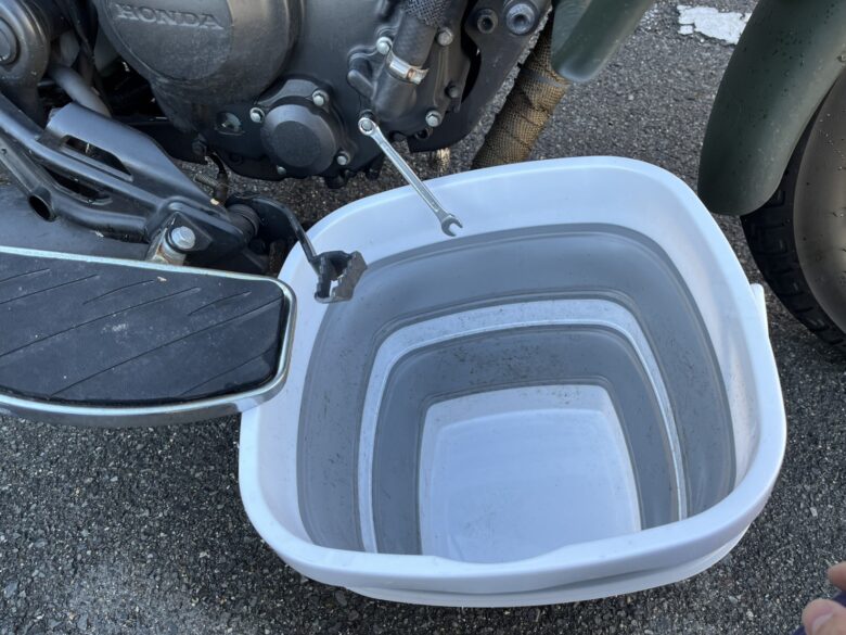排出口はエンジンのマフラー側の面にありますので、ブレーキペダルの辺りにバケツを用意しておきます。