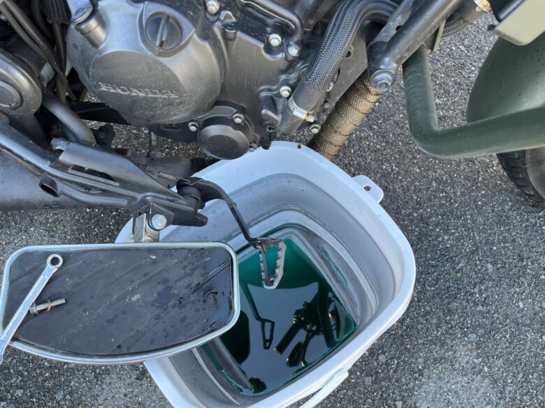 排出口からクーラントが出終わっても、傾けるとまだ少し排出されますので、傾けた状態でも出てこなくなったらOKです。