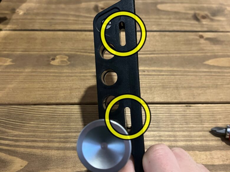 ステーの両端には、もともと穴が空いています(黄色の○印)。