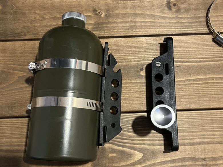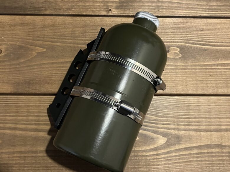 ホースバンドを2本使い、携行缶をしっかり固定します。